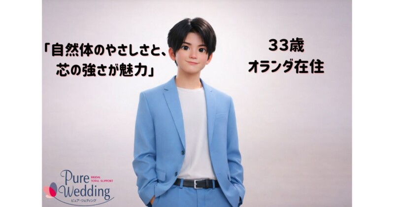 お写真はクールな印象ですが、実際にお話しするととても優しく穏やかな雰囲気で、親しみやすさを感じる33歳男性(オランダ在住)です。